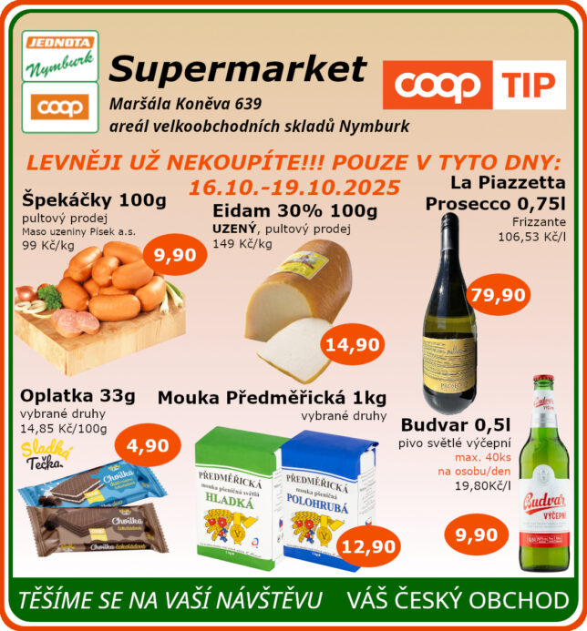 SUPERMARKET Maršála Koněva 639, Nymburk platnost od 16.10. do 19.10.2025 10.10.2025 / Renata Hervertová