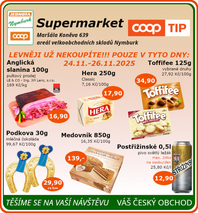 SUPERMARKET Maršála Koněva 639, Nymburk platnost od 24.11. do 26.11.2025 11.11.2025 / Renata Hervertová