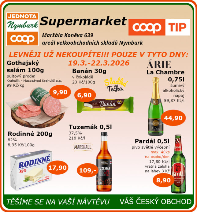 SUPERMARKET Maršála Koněva 639, Nymburk platnost od 19.3. do 22.3.2026 13.3.2026 autor: Renata Hervertová