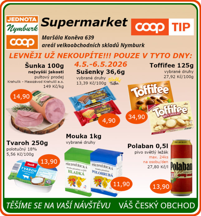 SUPERMARKET Maršála Koněva 639, Nymburk platnost od 4.5. do 6.5.2026 24.4.2026 autor: Renata Hervertová